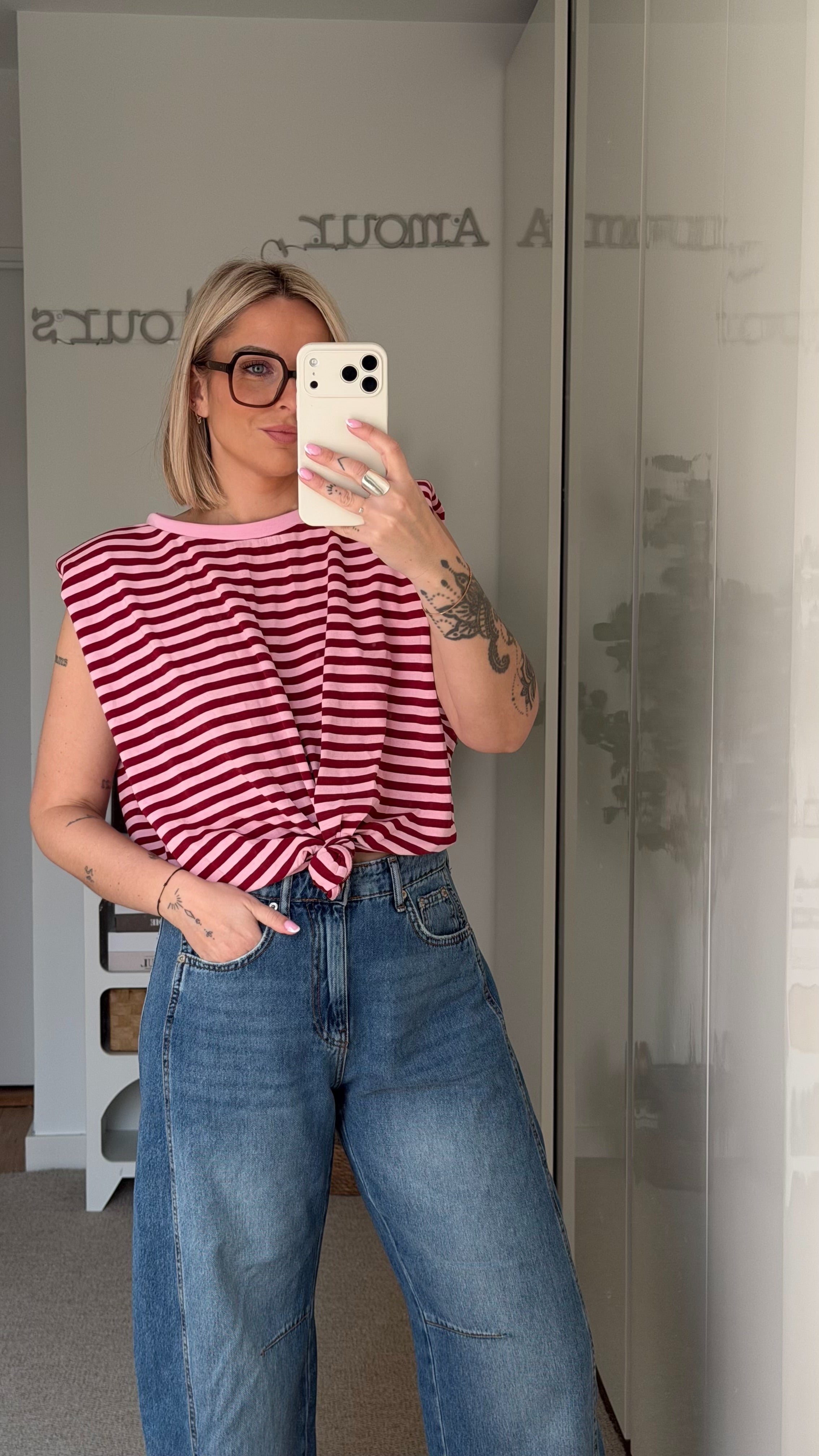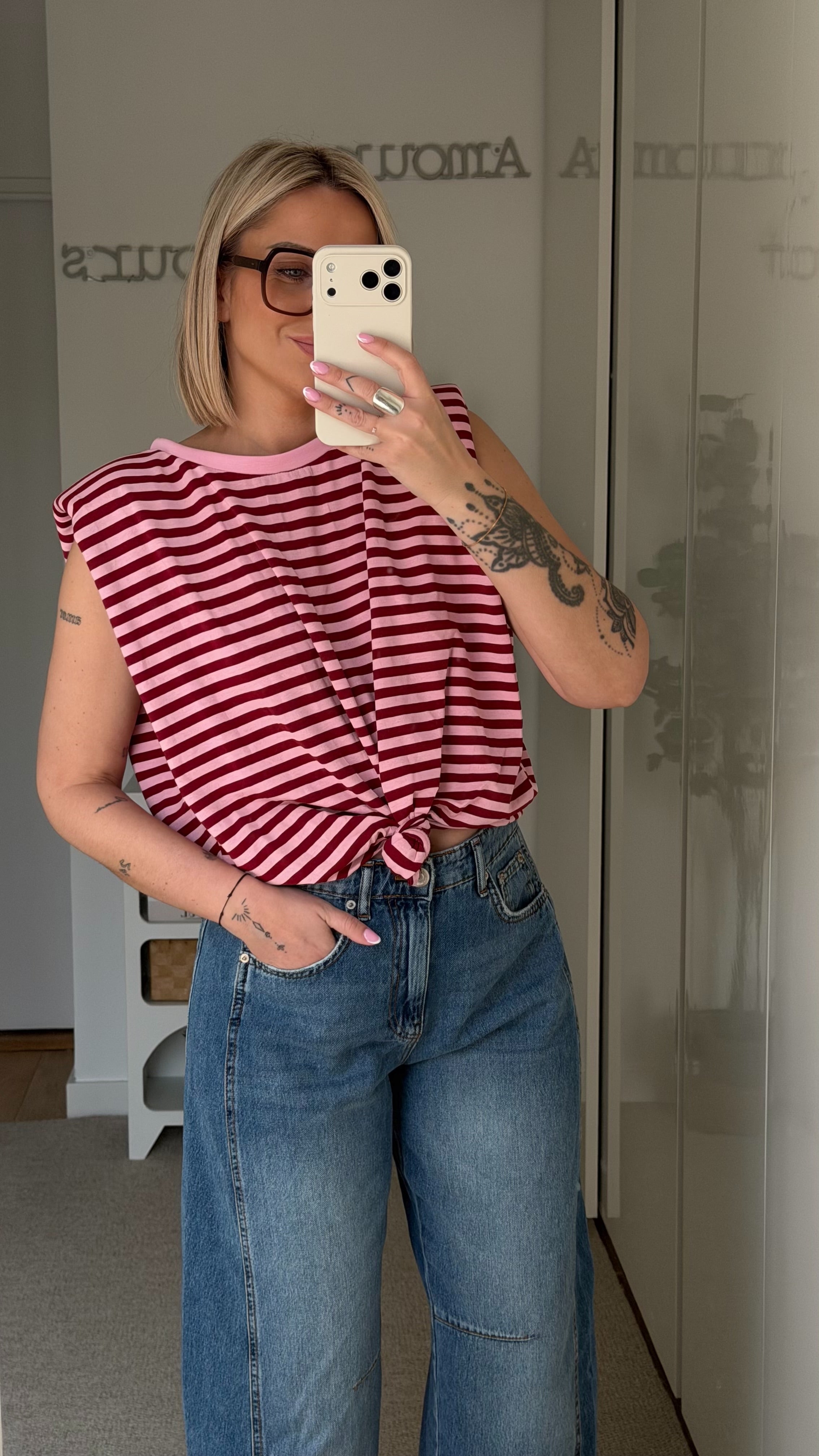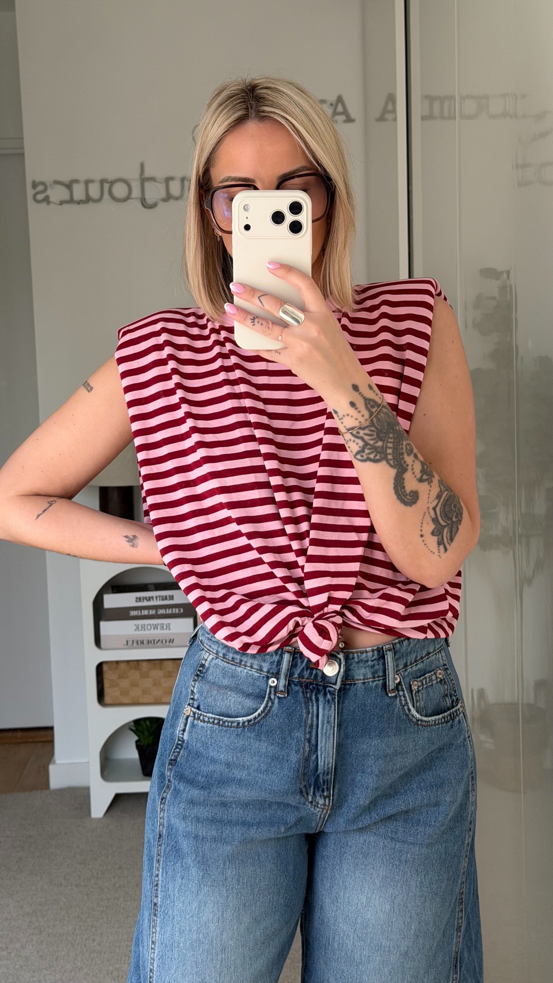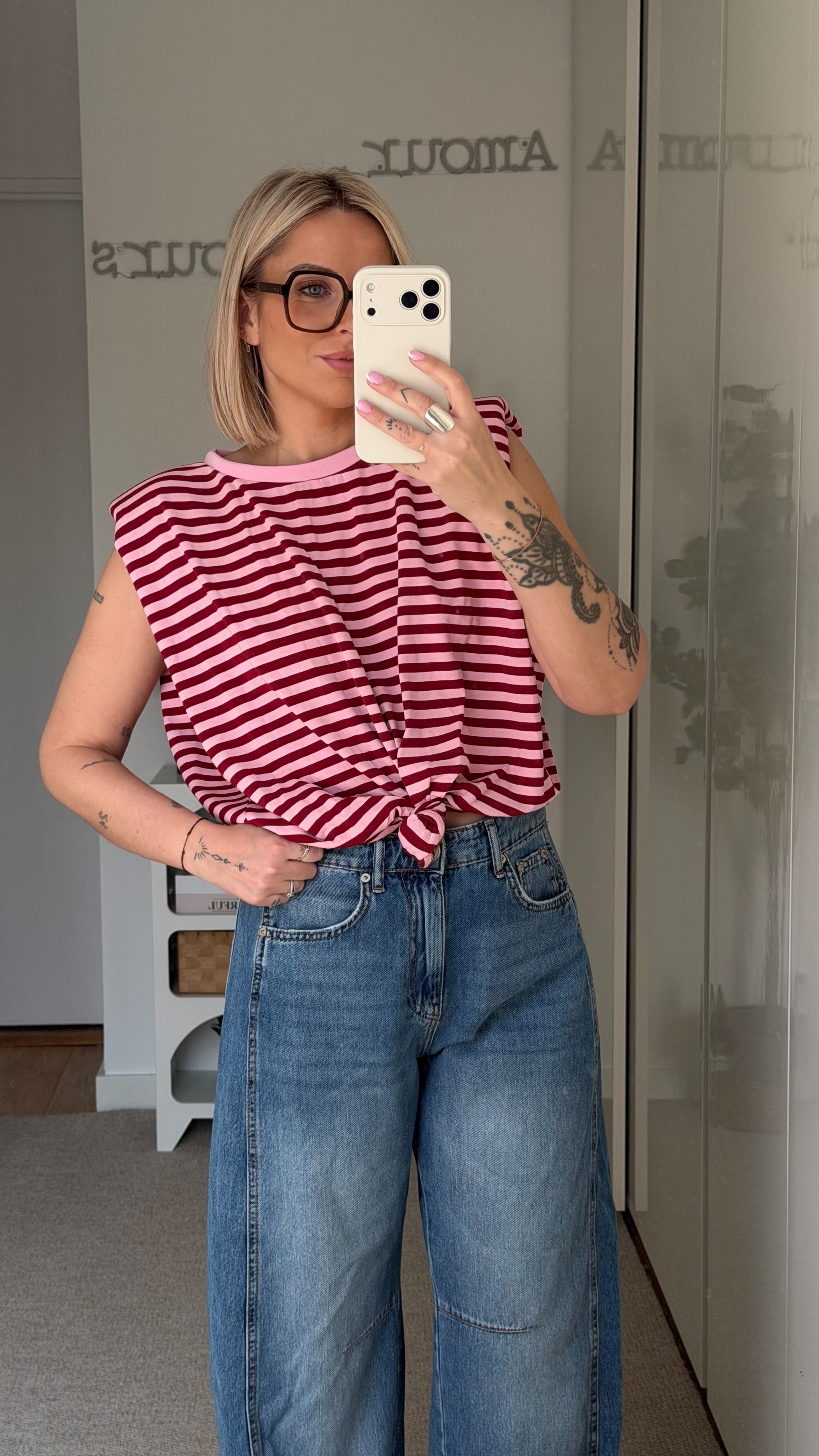 - Marinière à rayures horizontales bordeaux et rose.