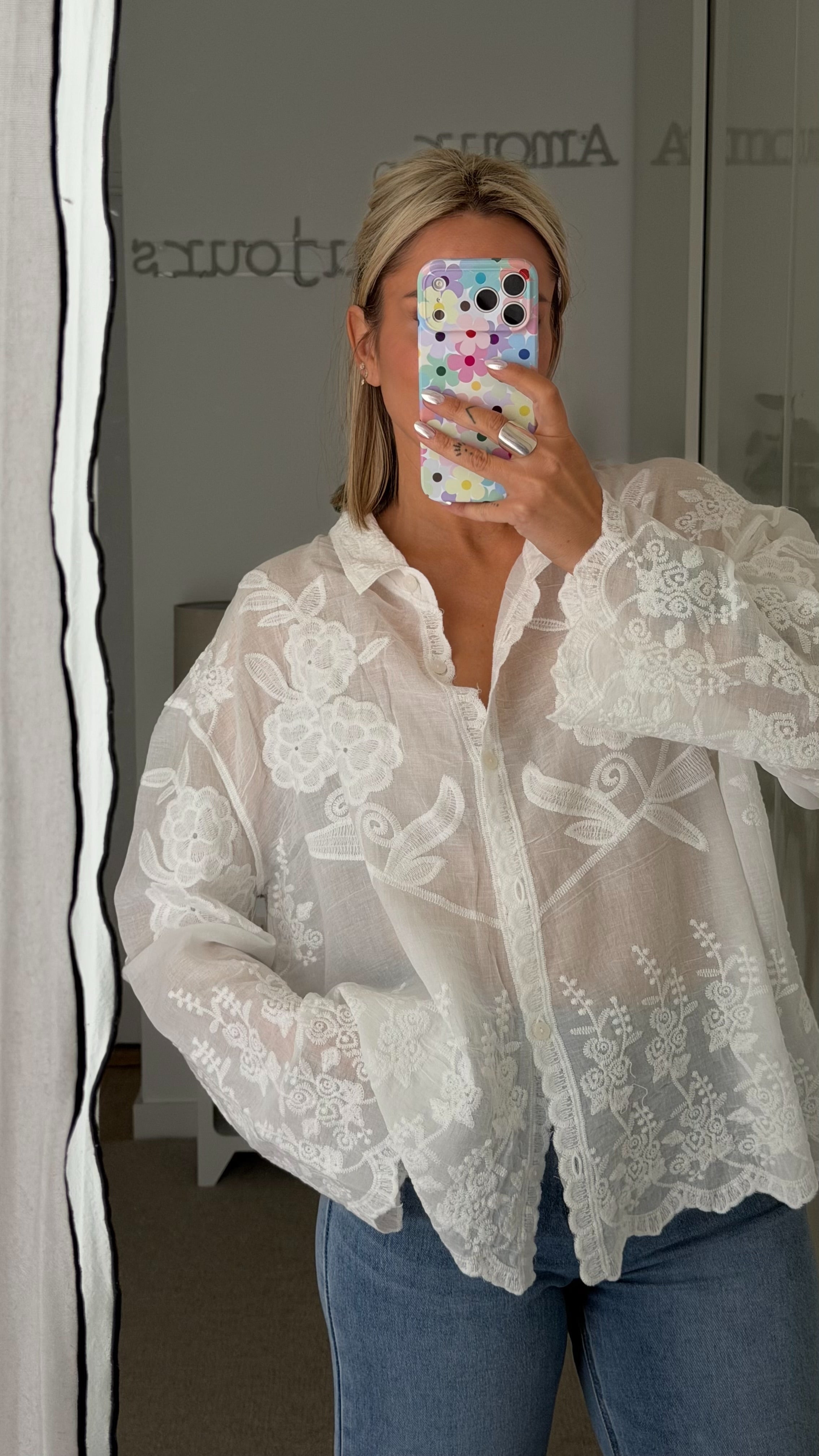 - Bas de la chemise festonné et découpé pour une finition en dentelle.